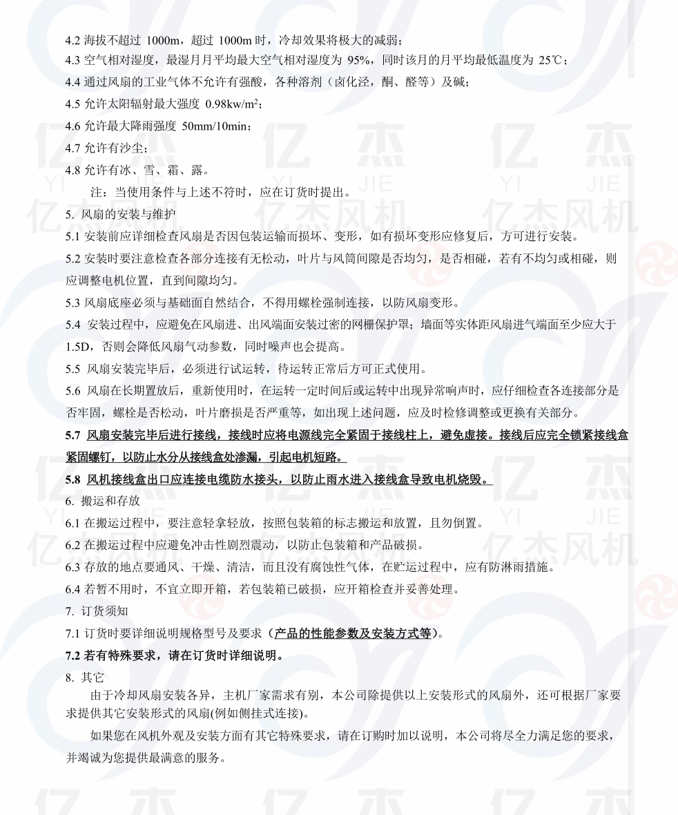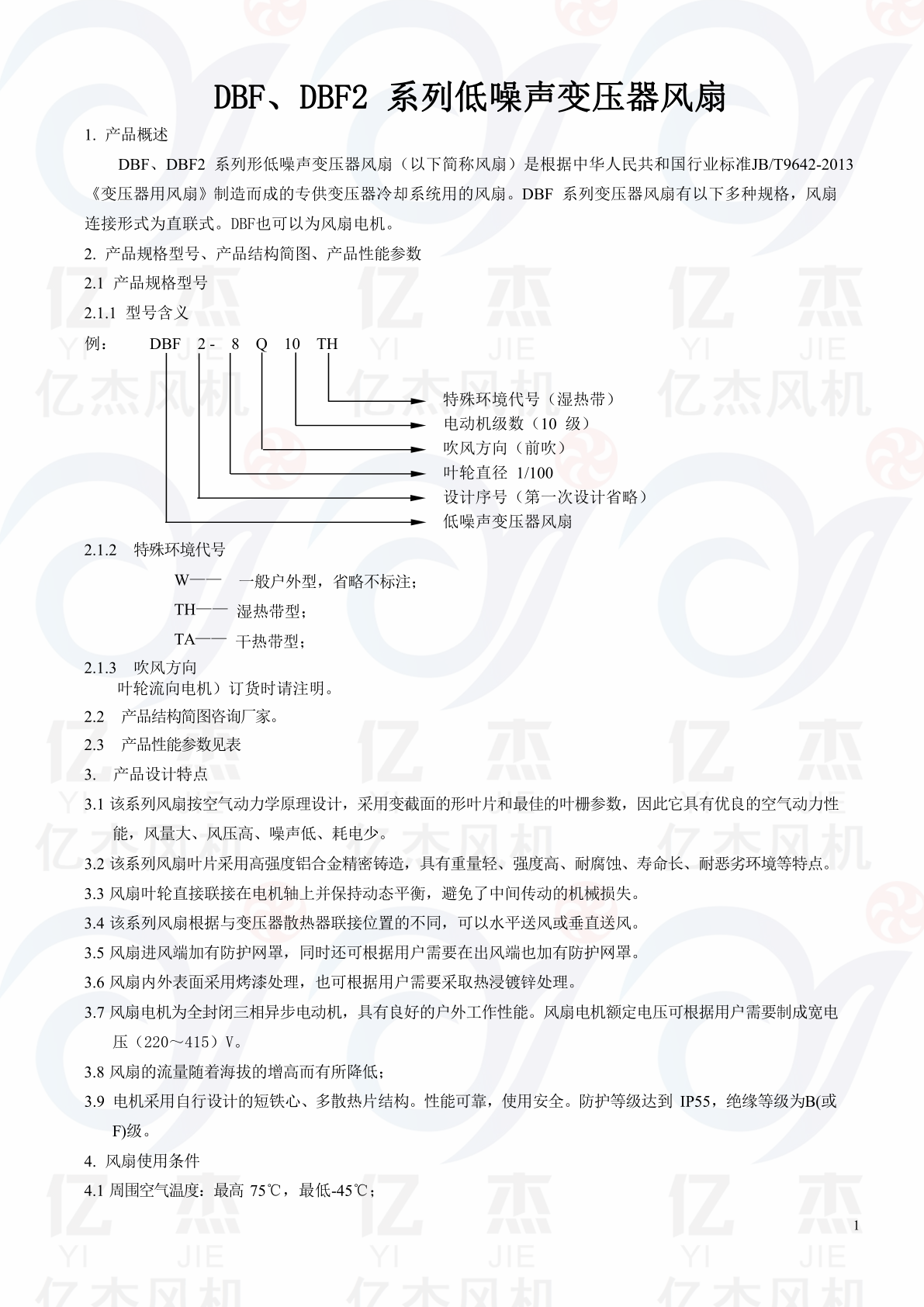 DBF系列变压器风扇 CFZ系列变压器风使用环境条件 :围空气温度:-40℃~75℃, 空气相对湿度:平均相对湿度为95%,同时该平均低的温度为25℃。海拔不超过1000m(超过1000m时电机温升应按标准进行修正)。太阳辐射强度:0.98KW/m2。降雨强度:50mm/10min。砂尘、冰、雪、霜、露:有。电机采用B级绝缘,当海拔不超过1000m,周围空气温度不超过75℃,其定子绕组的温度限值(电阻法)不超过45K,轴承允许温度(温度计法)不超过95℃。采用低噪声轴承,在正常的使用条件下,能承受额定负载连续运行,其使用寿命为10年,并能保证在一次大修前运行时间不少于5年。